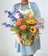 Towering delphiniums bring cool blue drama, while lush stock adds texture and fragrance in vibrant purple tones. Bright, cheerful sunflowers shine like summer itself, and vivid roses in hot orange hues bring fiery passion to the mix. Every stem is placed with artistic intent, creating an arrangement that feels alive with color and movement.